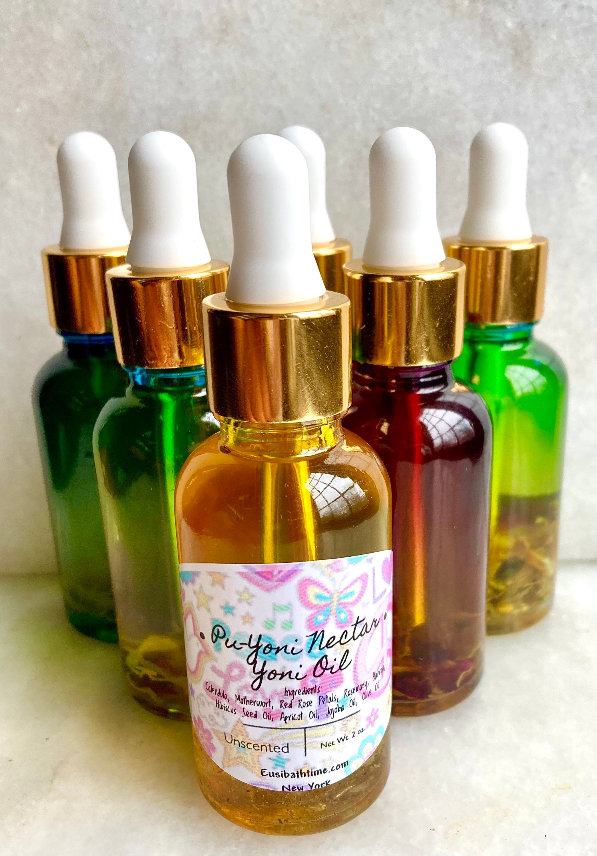 Yoni Oil is a blend of natural oils that are often infused with essential oils and herbs to care for feminine hygiene and vaginal self care.
